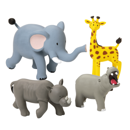 Dalla soleggiata savana africana arrivano: il cucciolo di giraffa, il suricato, il cuccioletto di iena e la piccola zebra.